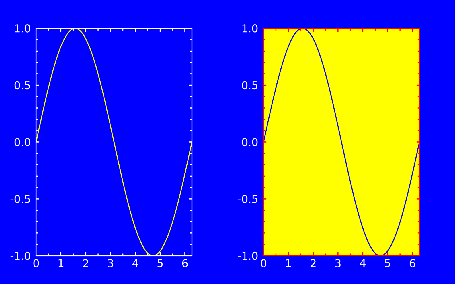 IDL plot object exercise No. 1Try to reproduce the figure below. It's a test for setting different colors for plots in the same window. The colors used are 'blue', 'yellow', 'white' and 'red'. The curve is just a sine wave.