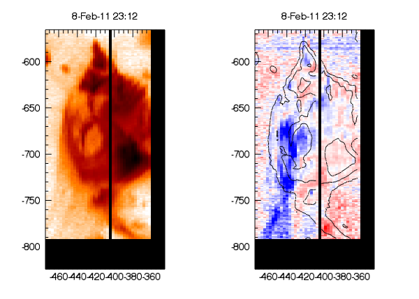 The AIA 193 data are best studied in terms of the difference movie which is shown for the period 22:30 to 24:00. This movie initially shows a bright white patch at Y=-700.This has dimmed by 23:00, with only a bright shell around the original location. Again in the difference movie, a long, narrow white feature is apparent from 23:05 to 23:20 at the left edge of the BP complex (X=-440). The feature has a kinked structure that is similar to the EIS feature, although the EIS velocity feature is much broader.