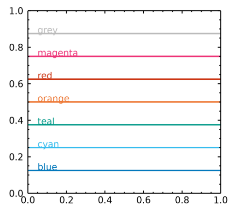 Using colors in IDLDr. Peter R. Young, 5-Sep-2025 This document gives some suggestions for setting colors in IDL when using IDL plot objects (not direct graphics). The routines mentioned below are available in the GitHub repository https://github.com/pryoung/idl_misc. Colors for the color blindScientific figures are often difficult to interpret for color blind people, particularly if red and green are used. Paul Tol gives advice on what colors are good for the color blind, and his website is at: https://sronpersonalpages.nl/~pault/. This site is blocked at my workplace, however, so you can also check the following: https://cran.r-project.org/web/packages/khroma/vignettes/tol.html. The company Enchroma has an online color blind test if you want to check your own eyesight. The Tol color tablesPaul Tol gives RGB numbers for five color schemes that he recommends using when creating line plots for color blind people. I have implemented these in the IDL routine color_tol.pro that is available in the GitHub repository listed above. As an example of how to use this routine, consider the code below: IDL> p=color_tol(/example) which generates the plot below. This shows the color options for the default "vibrant" color scheme. You can then use one of these colors for a plot by doing:
